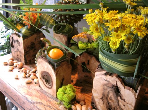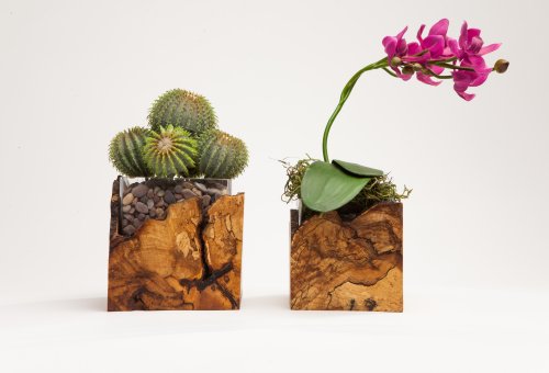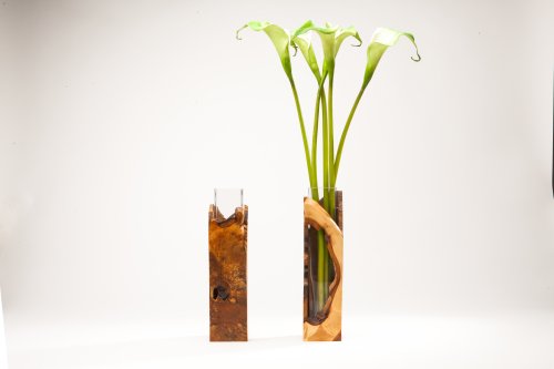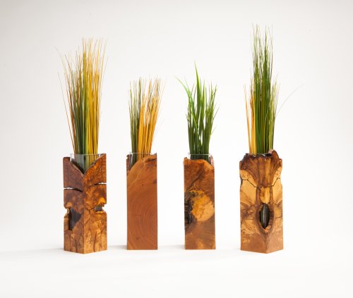 Maple burl and glass vases