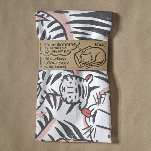Fall asleep dreaming of happy tigers! This pillow case will fit on any standard size bed pillow. Hand silk screened with water based ink in grey, peach and coral.