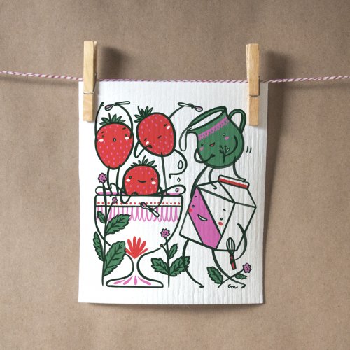A super absorbent, quick drying tea towel. The more you wash and dry the better this towel works! Hand silk screened with water based ink in coral red and brown.